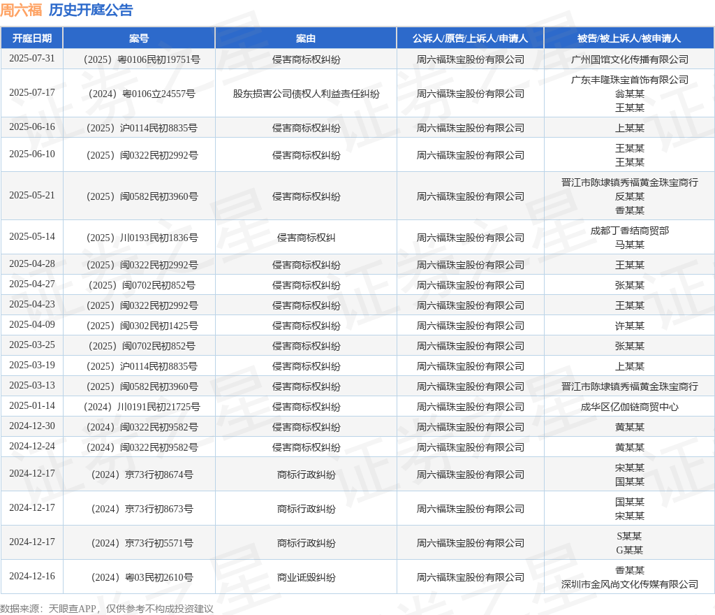 案号:(2025)闽0702民初852号审理法院:南平市延平区人民法院案由:侵害商标权纠纷当事人信息: 原告/上诉人:周六福珠宝股份有限公司 被告/被上诉人:张某某开庭日期:2025年4月27日根据统计,近一年内以周六福珠宝股份有限公司为当事人的历史开庭公告有35则,其中案由为“侵害商标权纠纷”的公告以23则居首,其次为“合同纠纷”有3则,“商标行政纠纷”有3则。历史开庭公告(前20条)如下: