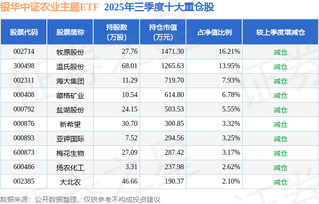 从基金规模来看,银华中证农业主题ETF基金2025年三季度公布的基金规模为0.91亿元,较上一期规模9296.33万元变化了-222.48万元,环比变化了-2.39%。该基金最新一期资产配置为:股票占净值比98.12%,无债券类资产,现金占净值比2.37%。从基金持仓来看,该基金当季前十大股票仓位达64.88%,第一大重仓股为牧原股份(002714),持仓占比为16.21%。