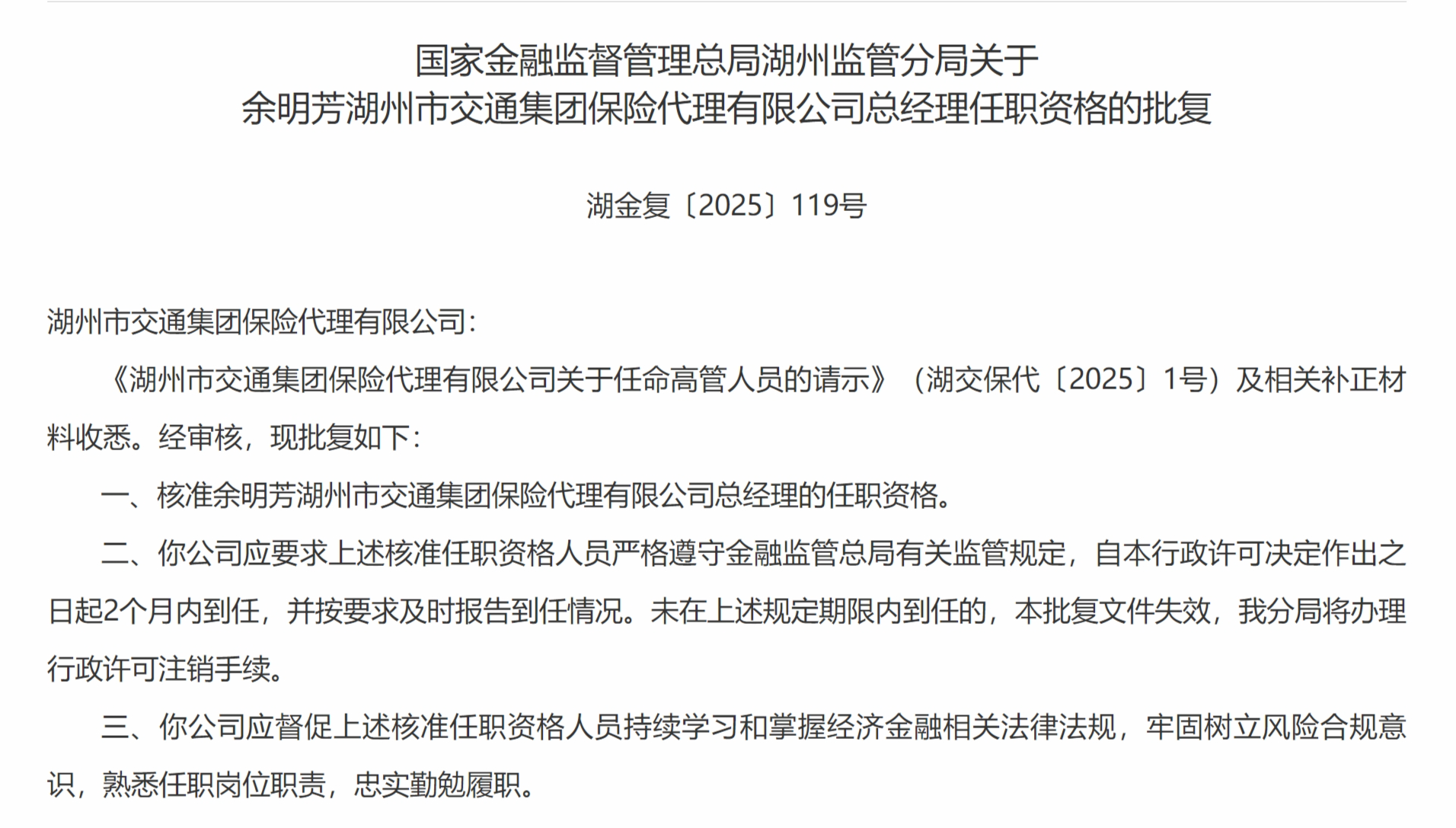 11月20日,国家金融监督管理总局湖州监管分局发布关于余明芳湖州市交通集团保险代理有限公司总经理任职资格的批复,核准余明芳湖州市交通集团保险代理有限公司总经理的任职资格。